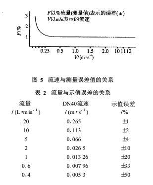 由EMF的測量原理可知,其流量的下限由同噪聲或偏移的信噪比S/N 來決定,其上限則由測量管內(nèi)襯里的磨損和配管的經(jīng)濟速度等來決定。一般當測量管內(nèi)實際流速小于0.1m/s時,感應電動勢已變得十分微弱(幾微伏至零點幾微伏),此時噪聲的影響逐步變?yōu)橹鲗?,甚至淹沒信號電動勢。其流速和測量誤差的關系詳見圖 5和表2。