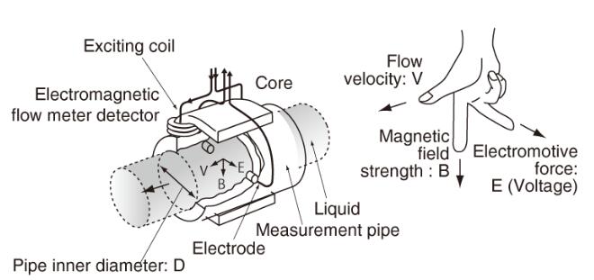 根據(jù)法拉*感應(yīng)定律,在磁場內(nèi)移動導(dǎo)電液體會產(chǎn)生管內(nèi)徑,磁場強度和平均流速都成比例的電動勢(電壓)。換句話說,在磁場中移動的液體的流速被轉(zhuǎn)換成電力。(E正比于V×B×D)