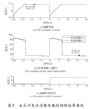 實(shí)驗(yàn)結(jié)果表明,高壓源向低壓源切換后,三端穩(wěn)壓器的工作特性致使的電流波動(dòng)和低壓源供電情況下的恒流控制,會(huì)大幅延長勵(lì)磁電流的穩(wěn)態(tài)響應(yīng)時(shí)間。圖8所示勵(lì)磁電流約在17ms左右進(jìn)入穩(wěn)態(tài),圖9所示勵(lì)磁電流的穩(wěn)態(tài)響應(yīng)時(shí)間約為12ms。這表明,在采用三端穩(wěn)壓器搭建恒流控制電路的情況下,電流旁路電路能有效克服三端穩(wěn)壓器工作特性的影響,并能方便的實(shí)現(xiàn)電流超調(diào),加快勵(lì)磁電流的響應(yīng)速度。