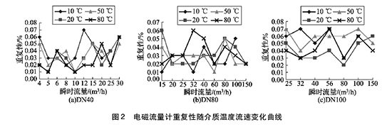 將實(shí)驗(yàn)測得的給排水流量計(jì)在不同溫度及流速下的重復(fù)性數(shù)據(jù)整理,特性曲線如圖2所示,3組曲線分別對應(yīng)DN40, DN80, DN100的3塊給排水流量計(jì)的重復(fù)性曲線。