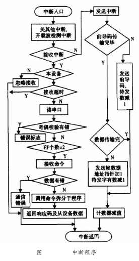 在HART通信中,地下污水流量計(jì)作為從設(shè)備進(jìn)行通訊,所以這里的軟件設(shè)計(jì)只是針對于從設(shè)備。HART通信采用水平和垂直校驗(yàn)的方法。當(dāng)檢測到接收數(shù)據(jù)有差錯時,則等到主設(shè)備命令幀發(fā)完后,通知主設(shè)備數(shù)據(jù)接收有誤。主設(shè)備則重新發(fā)命令幀,從而保證通信的準(zhǔn)確可靠。HART中斷子程序流程圖如圖6所示。由于HART通信為主從方式,HART幀中每個字節(jié)在物理層傳輸需要9ms左右,為了保證通訊的實(shí)時性,通訊程序采用串行口終端接收/發(fā)送。該中斷所要完成通信中的主要任務(wù),即接收和發(fā)送幀,幀的拆分和打包。