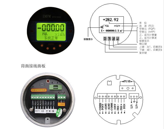 2、操作鍵和顯示按鍵式:4個薄膜按鍵可設(shè)定選擇全部參數(shù),也可利用PC機(RS232)對轉(zhuǎn)換器設(shè)定編程;3行LCD寬視角、寬溫、帶背光顯示;*1行顯示流量值;*2行顯示流量單位;*3行顯示流量百分比、正向總量、反向總量、差值總量、報警、流速。