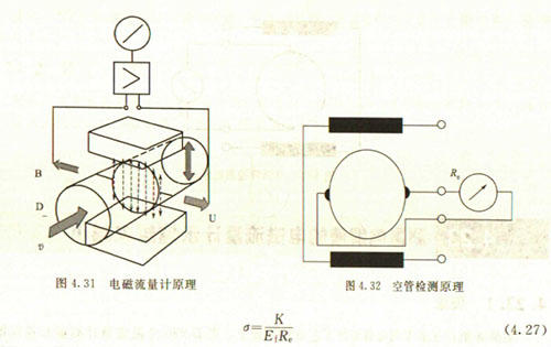 非滿管檢測也是基于電導率檢側(cè)的方法。在圖4.33所示的電磁流量傳感器中,增加了一個(或一對)非滿管檢測電極。當導管內(nèi)液體滿管時,頂部電極與其他電極之間的電阻值很小;而當存在非滿管情況時,頂部電極與導電液體之間有氣體阻隔,所以電極電阻顯著增大,從而做出非滿管判斷。