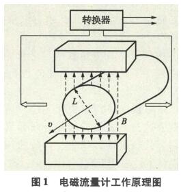 空調水流量計量表是利用法拉*電磁感應定律測量,如圖1所示,用于測量電極與運動的流體構成的回路中產生的電參數(shù),并根據公式換算成流體速度,再測量流通截面液位高度得到流通面積,兩者相乘得到所測流量。