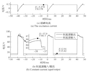 由圖7曲線結(jié)合圖2可知,在勵磁方向切換后,檢流電路檢測到的圖7(a)中的勵磁電流瞬間為負,此時勵磁線圈處于電能泄放狀態(tài)并向能量反饋電路中的儲能電容充電。由于儲能電容充電,高、低壓切換電路的輸出電壓從80V逐漸升高;待勵磁線圈能量泄放完即勵磁電流為零時,儲能電容兩端電壓達到*高86V并開始放電,勵磁電流開始上升;儲能電容電壓降低至80V時,高低壓切換電路趨于80V的穩(wěn)定輸出狀態(tài),此時勵磁電流繼續(xù)上升;待勵磁電流上升至設定的超調(diào)量205 mA后,遲滯比較電路控制高低壓切換電路切換至17V低壓源作為勵磁工作電源,恒流電路在17V低壓源輸入下進行恒流控制輸出。