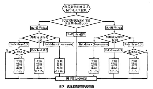 實際生產(chǎn)中流量一直在某個區(qū)域內(nèi)波動,且其動態(tài)特性不易掌握。從上面的理論中我們能夠讓誤差△£盡可能的小,這樣距我們所需要的理論值%就越接近。而減小誤差需要我們把n取的盡可能大,也就是在生產(chǎn)時間內(nèi)劃分更多的周期去調(diào)節(jié)流量。當(dāng)工控機根據(jù)測模具水流量計傳送回來的信號發(fā)出調(diào)節(jié)變頻器工作頻率的指令后,電機調(diào)整功率到測模具水流量計的實際測量為一個工作周期,我們知道從指令發(fā)送到實際測量值返回有一個較大的滯后,如果調(diào)節(jié)的周期時間小于流量計本身的一個工作周期,那么顯然不可能達到減小誤差的目的。利用模糊控制思想H。,在控制程序中我們把流量的波動區(qū)域劃分為±缸×Yo,Yo-t-O.3,Yo±0.5四個區(qū)域,其中缸為可調(diào)節(jié)的誤差范圍,生產(chǎn)中我們?nèi)?.015,流量區(qū)域劃分的單位均為t/h。針對不同的區(qū)域采取不同的調(diào)整方案。具體流程如圖3所示。圖中變量Rel表示實際測量的流量,變量Idea表示理論流量。