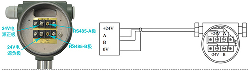 帶RS-485通訊功能的渦街流量計(jì)采用DC24V電源供電,與其它設(shè)備之間采用四線制傳輸方式。儀表端子接線見圖