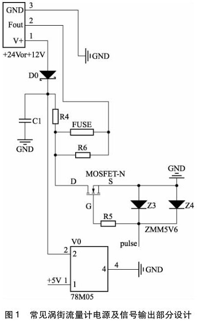 從圖1 中可以看到,供電電源 +24 V, +12 V均可,直流電源通過瓷片電容 C1 濾掉部分紋波,然后通過線性穩(wěn)壓芯片 78M05,得到 + 5 V 電壓,為后面的氮氣流量計信號處理電路供電,若要再得到 3. 3 V 電壓,通常會在 78M05 后再加一片線性穩(wěn)壓芯片 LM1117-3. 3,為了節(jié)約成本,供電電路沒有做 EMS 設(shè)計。同時,脈沖輸出部分,僅通過一個 MOS 管和兩個穩(wěn)壓管,也沒有 EMS 方面的設(shè)計考慮。