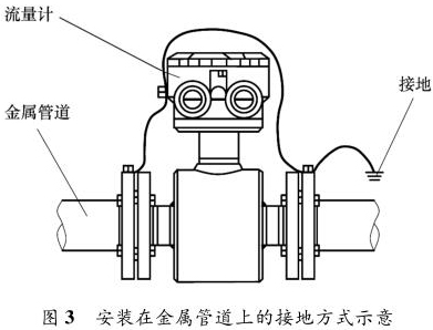 智能型防腐電磁流量計(jì)安裝在金屬管道上,安裝時(shí)將金屬管道與智能型防腐電磁流量計(jì)相連接,接地線再接入接地網(wǎng),如圖 3 所示。