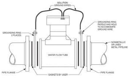 晶片式流量管:將晶片式流量管安裝在非金屬,塑料,PVC或帶襯里的工藝管道之間時,需要接地環(huán)。必須通過將隨附的隨附的SG連接線連接到接地環(huán),將SG傳遞到流量管的主體/外殼上(圖6.)。
