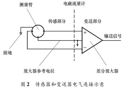 防腐型電磁流量計(jì)主要由兩部分組成:流量傳感器和信號變送器,如圖 2 所示。傳感器上的勵磁線圈接受變送器傳輸來的勵磁電流產(chǎn)生磁場,輸出感應(yīng)電動勢信號;信號變送器則將感應(yīng)電動勢信號轉(zhuǎn)換為流量信號或模擬量信號送至控制系統(tǒng)。防腐型電磁流量計(jì)按組成方式分為一體式和分體式。防腐型電磁流量計(jì)穩(wěn)定工作另外一個重要條件是接地。當(dāng)流體流動穿過磁場時(shí),以導(dǎo)電流體本身作為參考電位,在測量管一側(cè)電極產(chǎn)生正電勢,另一側(cè)產(chǎn)生負(fù)電勢,形成電勢差。但此電動勢信號一般只有幾毫伏,易受外界干擾。為防止干擾,將參考電位接入大地作為零電位,保證傳感器輸出精確穩(wěn)定的信號。傳感器和轉(zhuǎn)換器的接地端必須與被測介質(zhì)同電位,才能構(gòu)成對稱的輸入輸出回路。