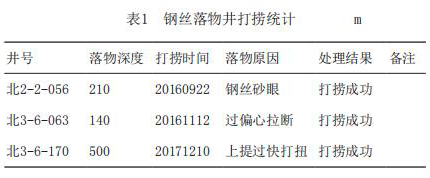 表1為一體式渦街流量計(jì)打撈統(tǒng)計(jì)表,可以看出自2016年9月開始即在現(xiàn)場(chǎng)進(jìn)行了應(yīng)用。為了展示試驗(yàn)成果的普遍性,分別從不同注入方式、不同落物深度、不同落物原因的角度,共應(yīng)用3口鋼絲落物井,打撈成功為100%。