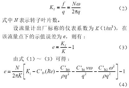 式中q表示體積流量,m3/s;ν表示介質(zhì)的運動黏度,m2/s;雷諾數(shù)Re=4q/(πdν);d表示流量計口徑,m;ρ表示介質(zhì)的密度,kg/m3;C'D、C'B0、C'B1和C'B2分別表示4個待定系數(shù),在某個流量點下標定出的儀表系數(shù)(Kf,表示單位體積流體通過流量計時,流量計輸出的脈沖數(shù),1/m3)和轉(zhuǎn)子葉片頻率(f,s-1)的關(guān)系為: