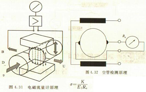 非滿管檢測也是基于電導(dǎo)率檢側(cè)的方法。在圖4.33所示的電磁流量傳感器中,增加了一個(或一對)非滿管檢測電極。當(dāng)導(dǎo)管內(nèi)液體滿管時,頂部電極與其他電極之間的電阻值很小;而當(dāng)存在非滿管情況時,頂部電極與導(dǎo)電液體之間有氣體阻隔,所以電極電阻顯著增大,從而做出非滿管判斷。