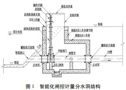 分水洞采用了一種封閉式啟閉閘集成閘井預制件,包括頂節(jié)、標準節(jié)和底座。與傳統(tǒng)現場澆筑的方式相比,集成閘井采用防水設計,并且安裝更加方便快捷,很大程度上提高了安裝效率,節(jié)約成本。采用事先預制好的啟閉閘支座、啟閉機機座,保證了設備的安裝精度,提高了設備運行的穩(wěn)定性,減少了設備的后期維護。分水洞結構除了預制混凝土外,還可考慮采用玻璃鋼或工程塑料整體制作,用標準節(jié)調節(jié)高度。分水洞結構設計見圖 1。