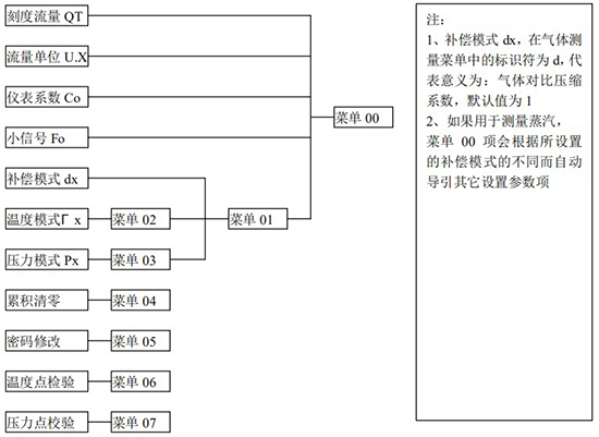 3.1、本儀表表頭采用自導(dǎo)引式和菜單式相結(jié)合的參數(shù)設(shè)置方式,所謂自導(dǎo)引式參數(shù)設(shè)置方式就是用戶在進入菜單 00 項后,表頭中的微電腦會自動導(dǎo)引用戶去設(shè)置需要設(shè)置的參數(shù)。另外,用戶也可以通過菜單模式分別對各組參數(shù)進行設(shè)置。蒸汽測量菜單框圖如下: