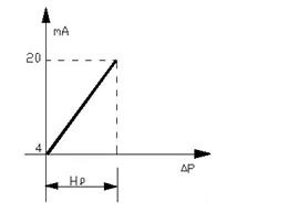 以電動(dòng)差壓變送器為例,當(dāng)液位H為O時(shí),差壓變送器輸出的信號(hào)應(yīng)為4 mA,當(dāng)液位H為*高液位時(shí),差壓變送器輸出的信號(hào)應(yīng)為20 mA,這是一種比較理想狀態(tài)。從圖1可見(jiàn),當(dāng)被測(cè)介質(zhì)的密度為ρ,容器中液體以上部分的氣相并不會(huì)凝結(jié)成冷凝液,這時(shí)作用于變送器正負(fù)壓室的差壓應(yīng)為:△Р= Hρ。其曲線如圖2所示: