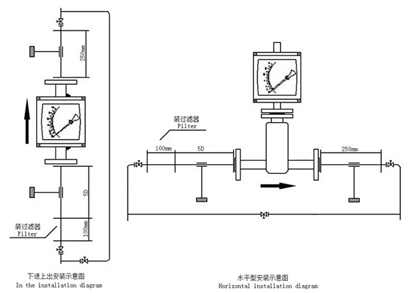 3.指針浮子流量計(jì)有垂直安裝和水平安裝形式,如果是垂直安裝形式,安裝垂直度應(yīng)該保證優(yōu)于1%,如果是水平安裝形式,安裝水平度都應(yīng)該保證優(yōu)于1%。