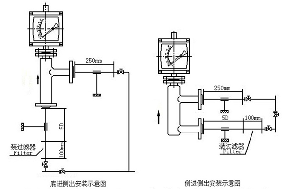 4.若介質(zhì)中含有固體雜質(zhì),應(yīng)在閥門和直管段間加裝過(guò)濾器;若介質(zhì)中含有鐵磁物質(zhì),應(yīng)在指針浮子流量計(jì)的上游安裝磁過(guò)濾器。