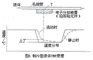 液體用tmf 在20世紀90年代初中期開始發(fā)展并在工業(yè)生產(chǎn)中應(yīng)用,但當前主要為微小流量儀表。有消耗功率測量法的熱分布式tmf和利用珀爾帖( peltier)致冷元件在檢測部位致冷(即附加熱)的tmf。后者的測量原理如圖6所示,流量傳感器由測量毛細管、電子冷卻裝置(珀爾帖元件)和3各溫度檢出件組成。測量管和致冷元件接觸,無液體流動時冷卻到某一溫度時,兩者溫度相等;液體流動時致冷元件附近測量毛細管溫度上升,如虛線所示分布,測量溫度檢測點的兩者溫度差以求的流量。