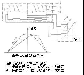 熱分布式tmf的工作原理如圖1所示,薄壁測(cè)量管3外壁繞著兩組兼作加熱器和檢測(cè)元件的繞組2,組成惠斯登電橋,由恒流電源5供給恒定熱量,通過(guò)線圈絕緣層、管壁、流體邊界層傳導(dǎo)熱量給管內(nèi)流體。邊界層內(nèi)熱的傳遞可以看作熱傳導(dǎo)方式實(shí)現(xiàn)的。在流量為零時(shí),測(cè)量管上的溫度分布如圖下部虛線所示,相對(duì)于測(cè)量管中心的上下游是對(duì)稱的,由線圈和電阻組成的電橋處于平衡狀態(tài);當(dāng)流體流動(dòng)時(shí),流體將上游的部分熱量帶給下游,導(dǎo)致溫度分布變化如實(shí)線所示,由電橋測(cè)出兩組線圈電阻值的變化,求得兩組線圈平均溫度差δt。便可按下式導(dǎo)出質(zhì)量流量qm,即