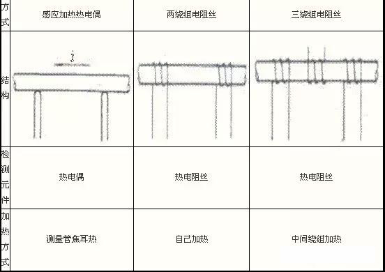 測(cè)量管加熱方式大部分產(chǎn)品采用兩繞組或三繞組線繞電阻;除管外電阻絲繞組加熱方式外還有利用管材本身電阻加熱方式,如表1所示。測(cè)量管形狀有直管形,還有∏字形結(jié)構(gòu),三繞組中一組在中間加熱,兩組分繞兩臂測(cè)量溫度。