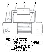 為了獲得良好的線形輸出,必須保持層流流動(dòng),測(cè)量管內(nèi)徑d設(shè)計(jì)得很小而長(zhǎng)度l很長(zhǎng),即有很大l/d比值,流速低,流量小。為擴(kuò)大儀表流量,還可采用在管道內(nèi)裝管束等層流阻流件;擴(kuò)大更大流量和口徑還常采用分流方式,在主管道內(nèi)裝層流阻流件(見圖3)以恒定比值分流部分流體到流量傳感部件。有些型號(hào)儀表也有用文丘里噴嘴等代替層流阻流件。