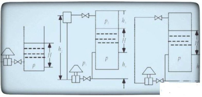 上圖中是靜壓差液位計(jì)的三類零點(diǎn)遷移,從左到右分別是無遷移、負(fù)遷移、正遷移。