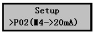 1)在儀表正常工作時按擊Mode鍵進入?yún)?shù)設(shè)置菜單后按擊▼鍵選擇P02(4~20mA)設(shè)置菜單,如右圖。